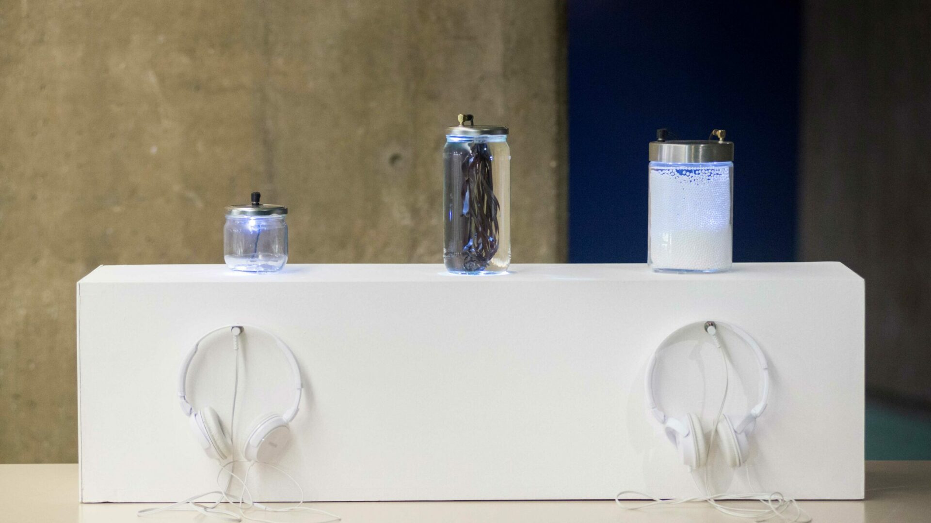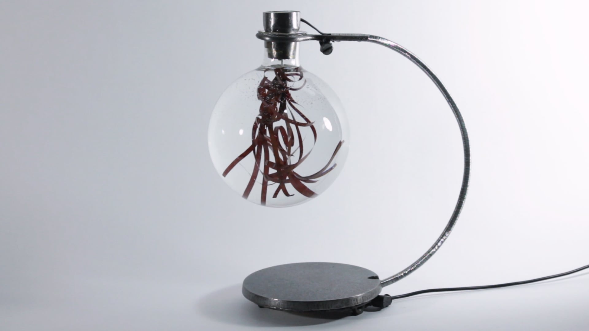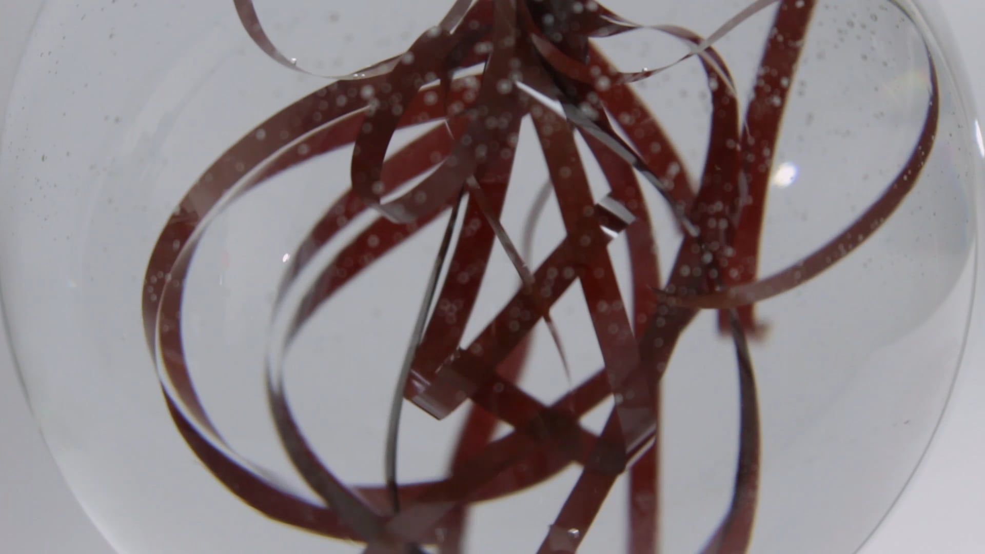 Dans différents bocaux en verres, des algues aux rythmes aléatoires tournoient comme des êtres aquatiques en incubation.